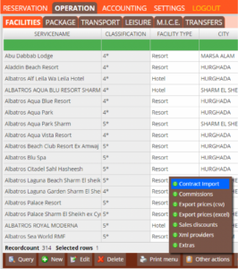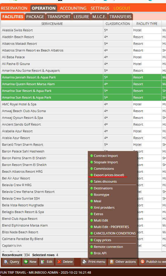 To export contract prices after you entered your system, please go to Operations / Facilities. Query the facilities, we suggest use Valid Contract option Yes, and choose target market on filter, so you may only have the related accommodation facilities on the screen. Choose the hotels using SHIFT or CTRL + mouse click. From the “Other actions” button on the bottom menu, choose “Export prices (excel)”.